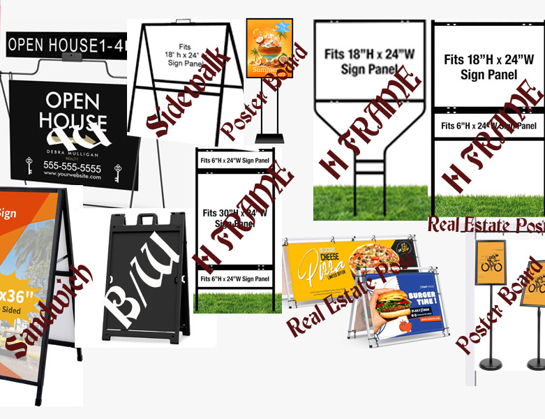 Real Estate Open House Sign: A frame - Sandwich; 24 x 36 Inch Double-Sided Folding Sandwich Board $100. A frame - 4U; Double-Sided Displays 22"x18" $100. A frame - Sidewalk Portable 18 x 24 Inch Double-Sided $100. A frame - Black "Signicade Deluxe" sign stand 24 x 36 $150. H Frame 30" x 24" Yard Sign Stand $150. H Frame 18" x 24" Yard Sign Stand $100. Poster Sign Stand 11 x 17 $100 & 22"x28" $150. Real Estate Post 4ft $200 & 8ft $250.